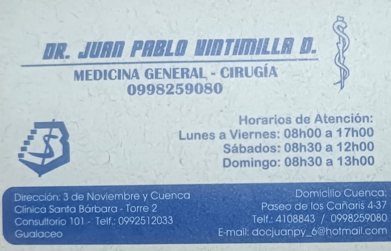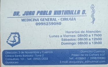 El Dr. Juan Pablo Vintimilla es un médico general y cirujano con más de 25 años de experiencia. Reconocido por su trato amable, precisión en diagnósticos y atención profesional.